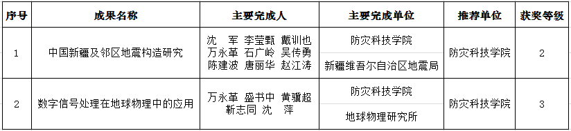 近日,中国地震局2017年度防震减灾科技成果奖评选结果揭晓,由防灾科技学院推荐,沈军教授等完成的“中国新疆及邻区地震构造研究”和万永革教授等完成的“数字信号处理在地球物理中的应用”项目分别获得中国地震局2017年度防震减灾科技成果奖二等奖和三等奖。