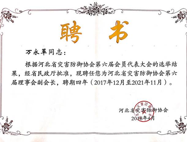 根据河北省灾害防御协会第六届会员代表大会的选举结果,经河北省民政厅批准,聘任beat365万永革教授为河北省灾害防御协会第六届理事会副会长,聘期四年(2017年12月至2021年11月)。(撰稿:黄骥超)