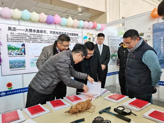 开幕式上,学生代表于鹏岳首先分享了参加暑期地质实习的收获感悟,语言风趣幽却不乏真情实感。团总支副书记田官正介绍了本届地学知识科普月及地质实习成果展活动的筹备情况和具体内容,总结了本次实习成果展出的特色创新。副院长孙珍军为本次活动致开幕词,预祝活动圆满成功。开幕式后,参加开幕式领导老师来到地质实习成果展展厅参观指导,认真聆听专业讲解员的介绍,并与在场老师同学交流互动,对实习成果和展出内容形式给予高度肯定。