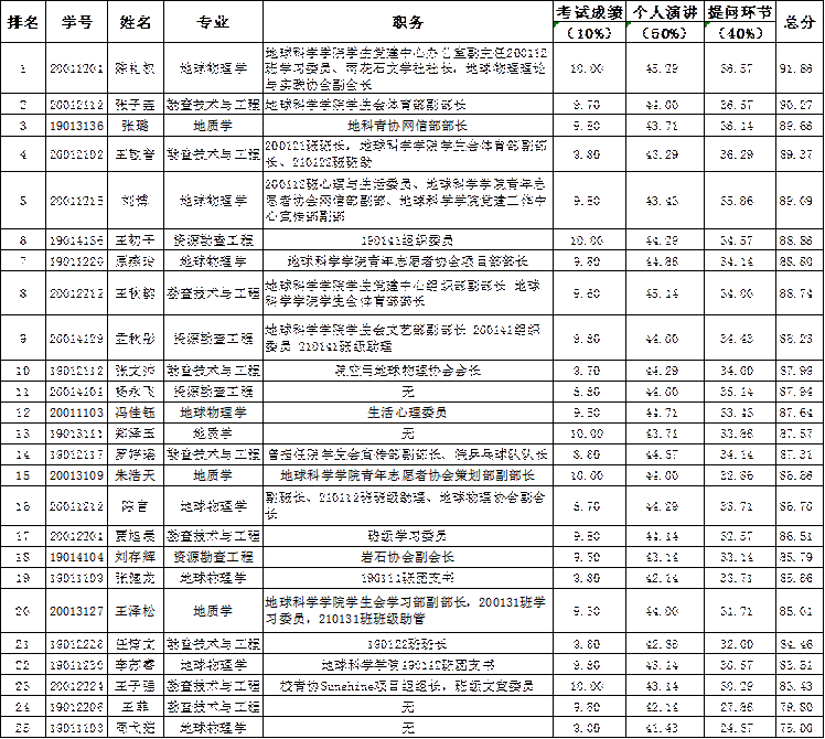 根据学院《beat365中文登录入口学生党员发展工作实施细则(试行)》规定,按照学院党总支的安排,2022年5月5日组织党员发展对象进行了汇报答辩,答辩成绩现予以公示: