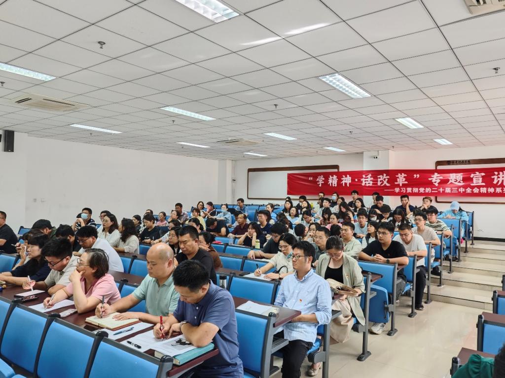为深入学习贯彻党的二十届三中全会精神,按照学校联合党委统一部署,9月13日,beat365中文登录入口党总支、生态环境学院党总支联合组织“学精神·话改革”专题宣讲活动,学校马克思主义学院院长李君教授应邀作全会精神辅导报告。beat365中文登录入口党总支书记陈灏杰主持宣讲活动,两个二级学院教职工和学生党员聆听报告。