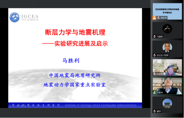 12月1日,河北省地震动力学重点实验室2022年度学术委员会会议暨学术报告会在beat365顺利召开,依据疫情防控要求,会议采取线上形式举行。出席会议的学术委员及专家有:中国地震局地质研究所马胜利研究员、中国地震局地球物理研究所丁志峰研究员、应急管理部国家自然灾害防治研究院陈小斌研究员、中国地震局地质研究所何宏林研究员、长江大学毛宁波教授、吉林大学刘财教授、南京工业大学谷洪彪教授、防灾科技学院任云生教授、姚运生研究员、刘春平教授、郭迅教授、洪利教授、万永革教授、沈军教授、姜纪沂教授、廖顺宝教授、顾观文教授。此外,重点实验室相关工作人员及beat365中文登录入口全体教师参加了会议,会议由重点实验室副主任孙珍军主持。